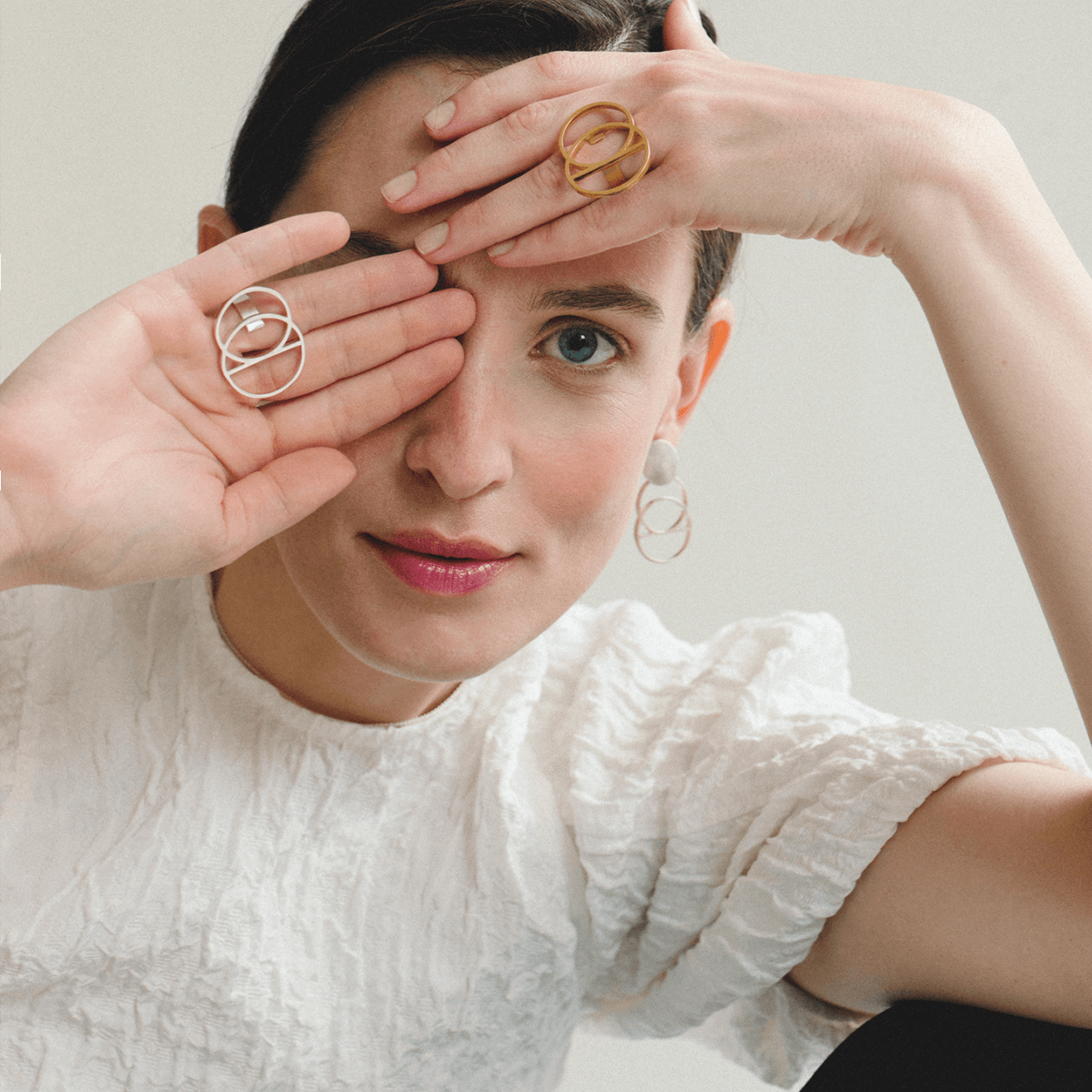 Poți alege diverse dimensiuni de inele atâta timp cât rămâi la același tip de linie și de textură. Combinația dintre o piesă cu aspect mat și una ce reflectă lumina, e dificilă în cazul bijuteriilor, pentru că trebuie să iei în calcul toate celelalte materiale din ținută, unde e chiar indicat să mixezi o textură mată cu una lucioasă. Iar pentru a crea un statement, ai nevoie de foarte puțin, respectiv de două piese cu design identic, dar din metale diferite. Poți combina două astfel de brățări sau de cercei, pe care să îi porți inclusiv simbolic, exprimându-ți latura masculină și feminină, luminoasă și întunecată, exact ca în alchimie.